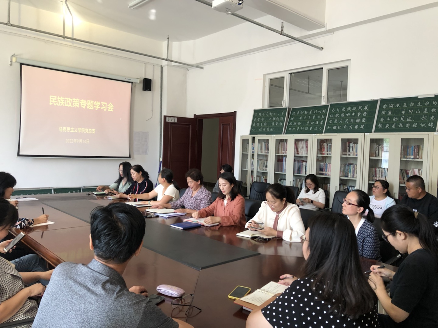 深入开展铸牢中华民族共同体意识教育,促进民族团结进步,2022年9月14日,304永利集团党总支理论学习中心组扩大学习会在崇文楼B123会议室召开专题学习。会议由党总支书记刘凤琴主持,学院全体教师参加。会上集中学习了《内蒙古自治区促进民族团结进步条例》、《内蒙古自治区教育条例》和《中华人民共和国国家通用语言文字法》等法律法规,同时要求各位老师自学《民族区域自治法》。