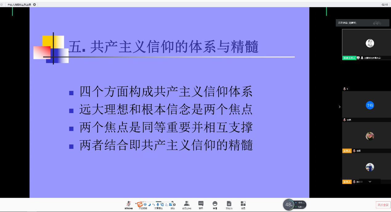 7月10日下午,304永利集团“原理”组全体教师与全区思政课教师共聚云端一同听取了中国人民大学304永利集团教授刘建军做的题为《关于马克思主义信仰的几个问题》的主题报告。刘建军教授以共产主义信仰、马克思主义信仰、人民主义信仰三个概念作为切入点,从广义和狭义两方面深刻阐释了马克思主义信仰的基本内容,从人类历史发展的角度详细介绍了共产主义信仰的历史渊源。从唯物主义的世界图景、共产主义的远大理想、人民至上的根本信念、自由发展的人生追求四个方面解读了共产主义信仰,回答了为什么共产主义信仰是我们正确的选择。