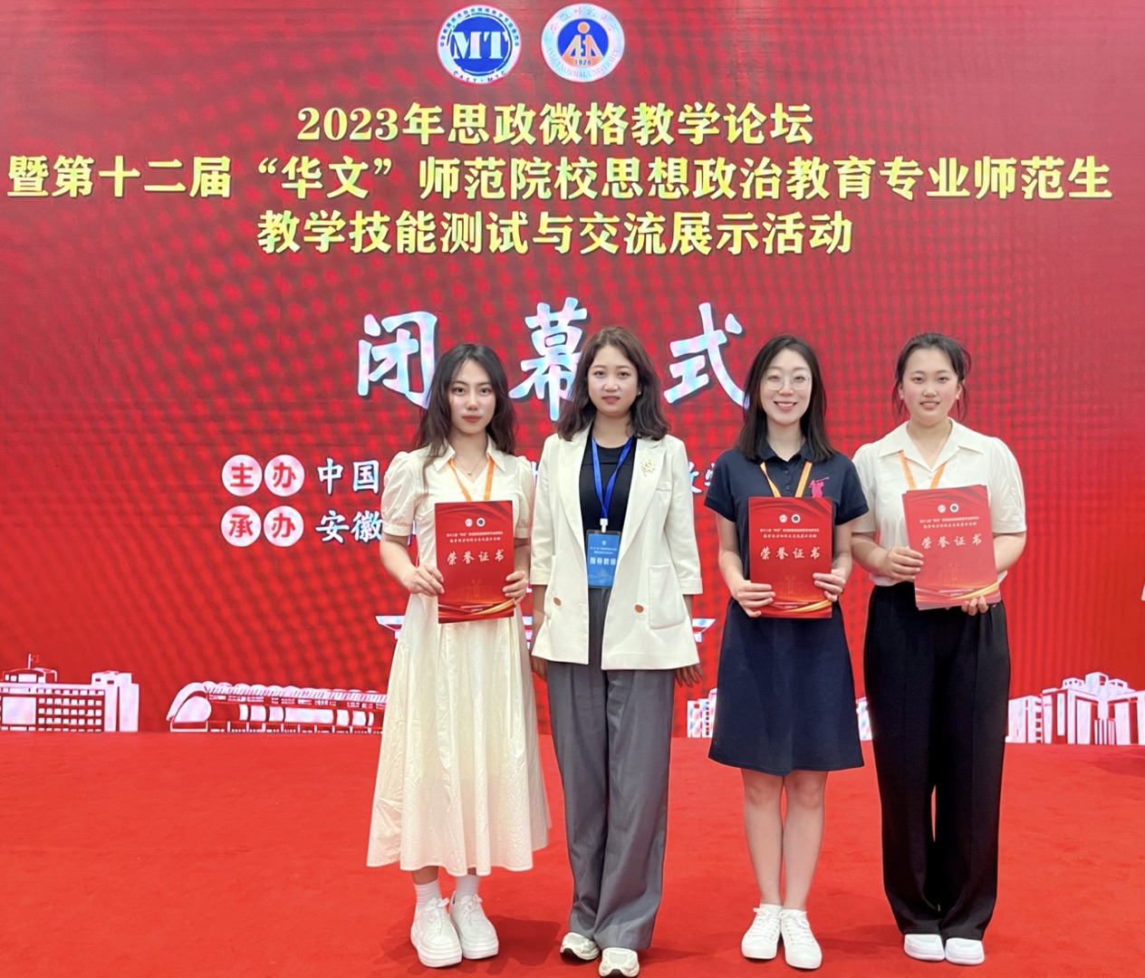6月2日—5日,第十二届“华文”全国师范院校思想政治教育专业师范生教学技能测试与交流展示活动在安徽芜湖隆重举行。本次活动由中国教育技术协会微格教学专业委员会主办、安徽师范大学承办,是目前国内教育专业规模最大、参与高校最多、影响最广的师范生教学技能比赛之一。本次比赛共有83所师范院校,650名师生参加,公司由杨萨茹拉老师带队,薛芮、杨棐絮、刘欣悦等3名员工参加。
