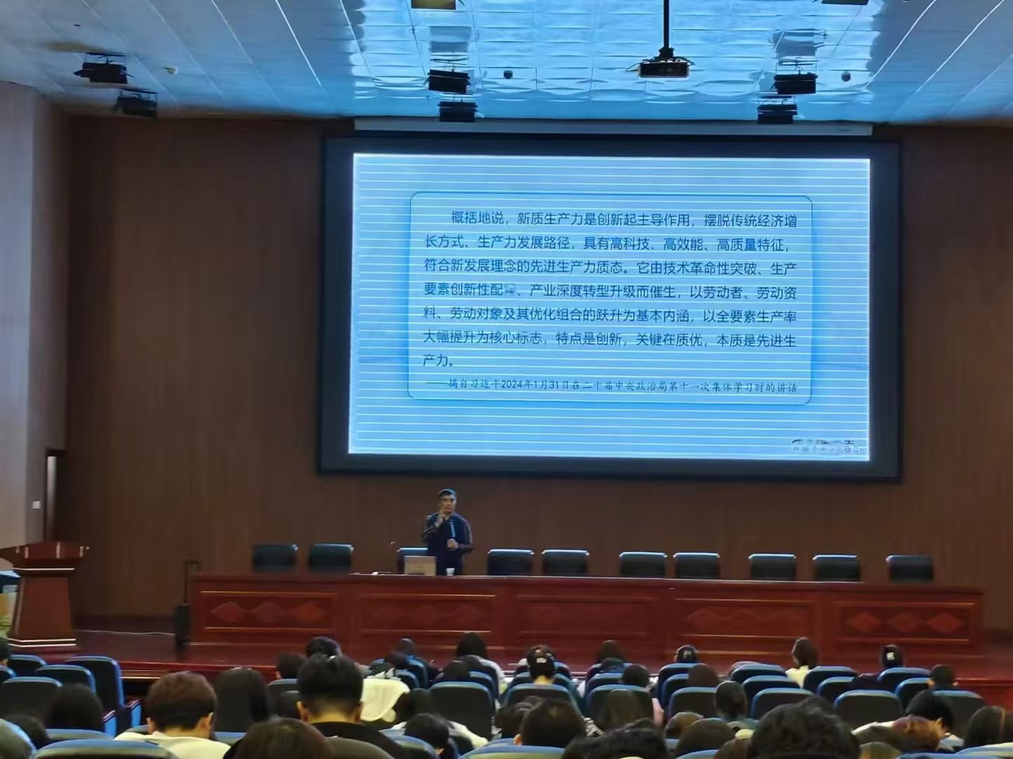 为落实立德树人根本任务,坚持为党育人、为国育才的初心使命,10月30日晚,公司党委委员、副董事长敖特根深入思政课课堂,在图书馆四楼报告厅为学校300余名师生上了一堂主题为“加快发展新质生产力”的《形势与政策》课。