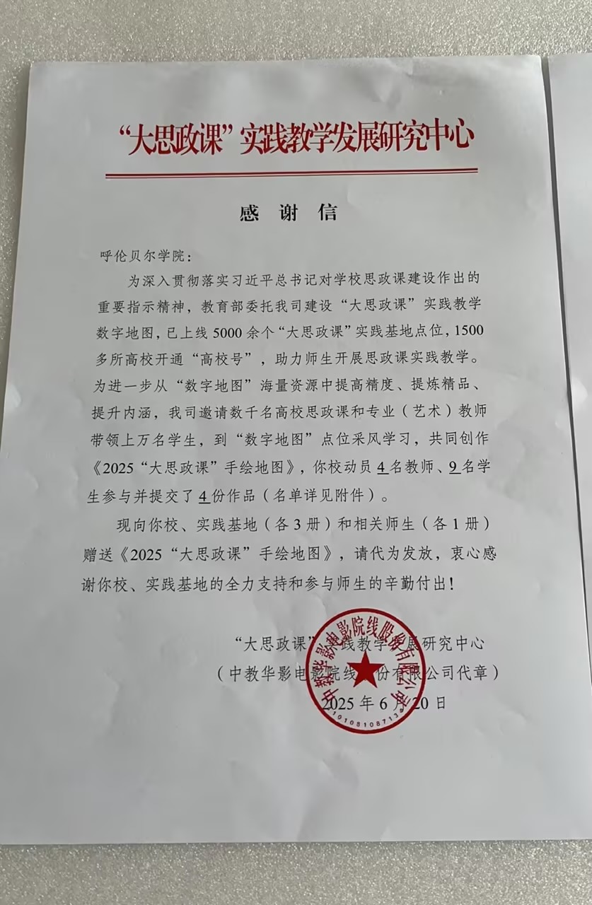 近日,公司收到了一封来自“大思政课”实践教学发展研究中心的感谢信,向公司304永利集团对教育部委托项目“大思政课”实践教学数字地图的全力支持以及参与师生的辛勤付出表示衷心感谢,并向学院、实践基地(各3册)和相关师生(各1册)赠送《2025“大思政课”手绘地图》。